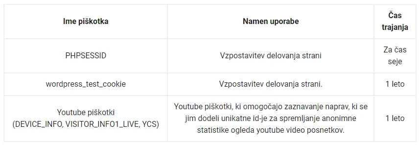 V skladu s priporočili informacijskega pooblaščenca, smo na našo spletno stran namestili obvestilo o uporabi piškotkov, hkrati pa smo vam omogočili tudi izbiro, katere piškotke želite uporabljati in katere ne.
